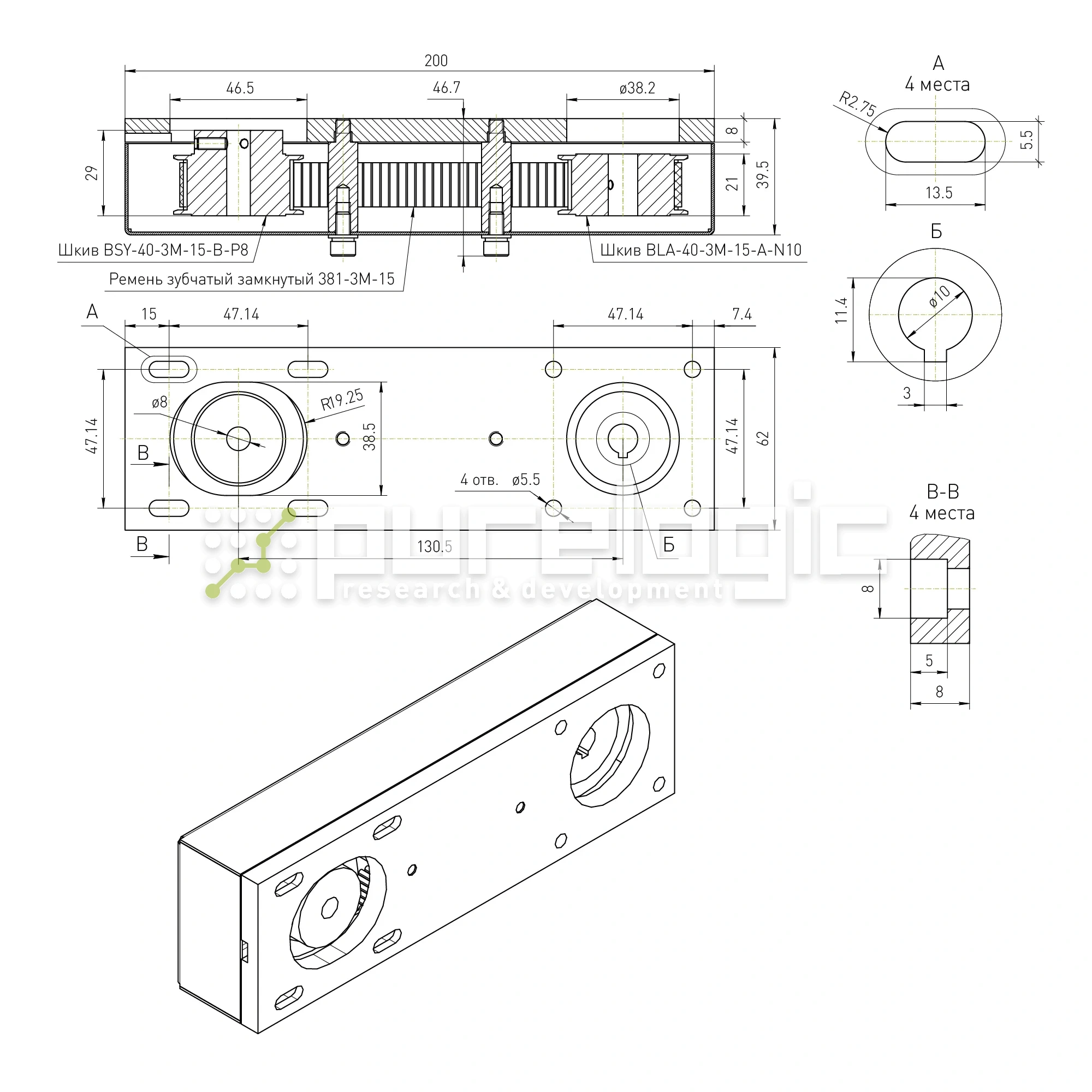 Блок бокового привода для установки приводных двигателей с фланцем 57 мм, валом 8 мм на модули серии PLLM-61 с передачей крутящего момента посредством зубчато-ременной передачи. В комплект приводного блока входят кронштейн, кожух, зубчатые шкивы, ремень и необходимый крепеж. Электродвигатель приобретается отдельно. Передача 1:1.