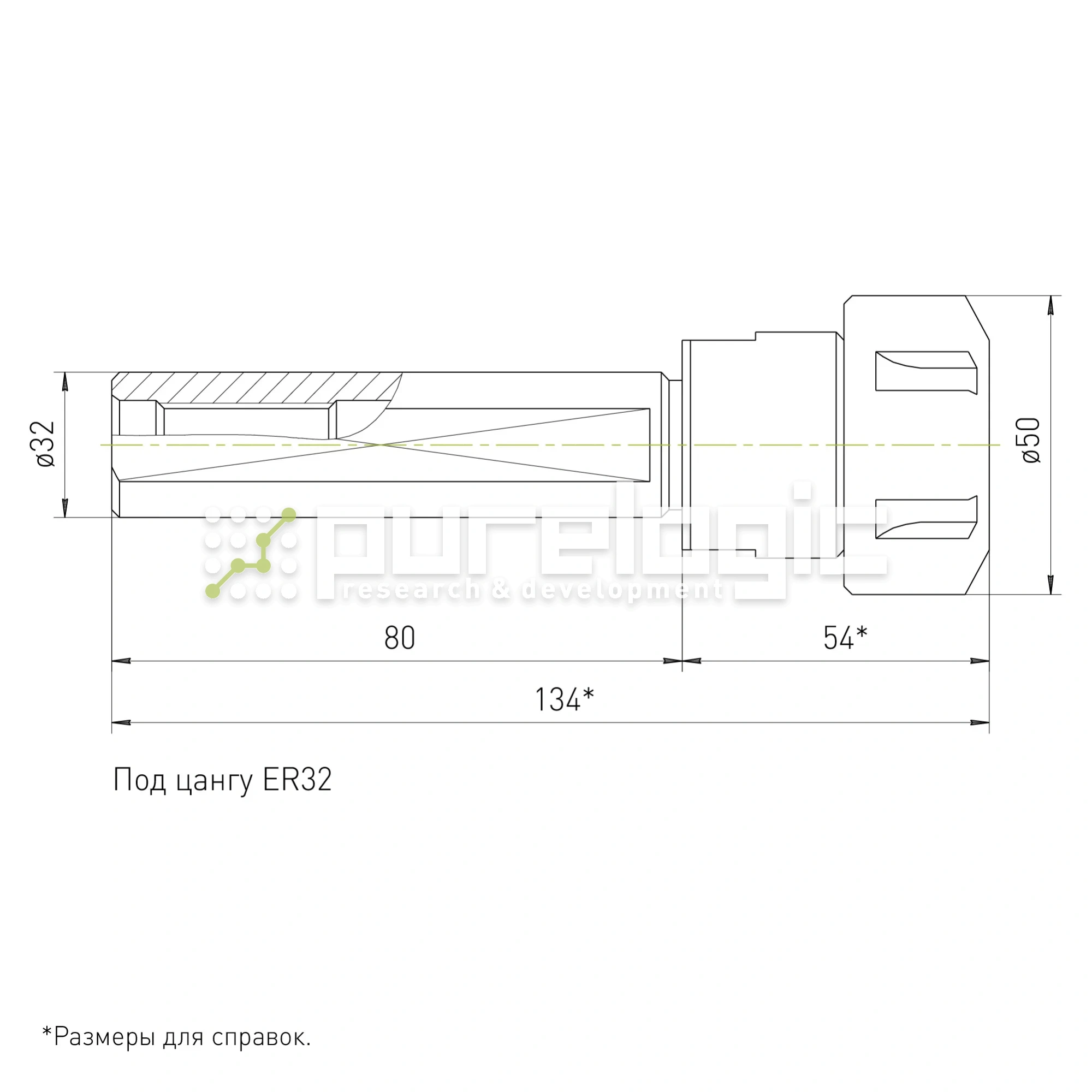 Цанговый патрон для закрепления фрез, с цилиндрическим хвостовиком с лыской. Удлинитель для цанг ER32. Может быть закреплен в более крупный цанговый патрон, в патрон Weldon, а также в осевой держатель инструмента на токарном станке. Длина хвостовика L=80мм, диаметр 32мм, внешний диаметр гайки D=50мм.