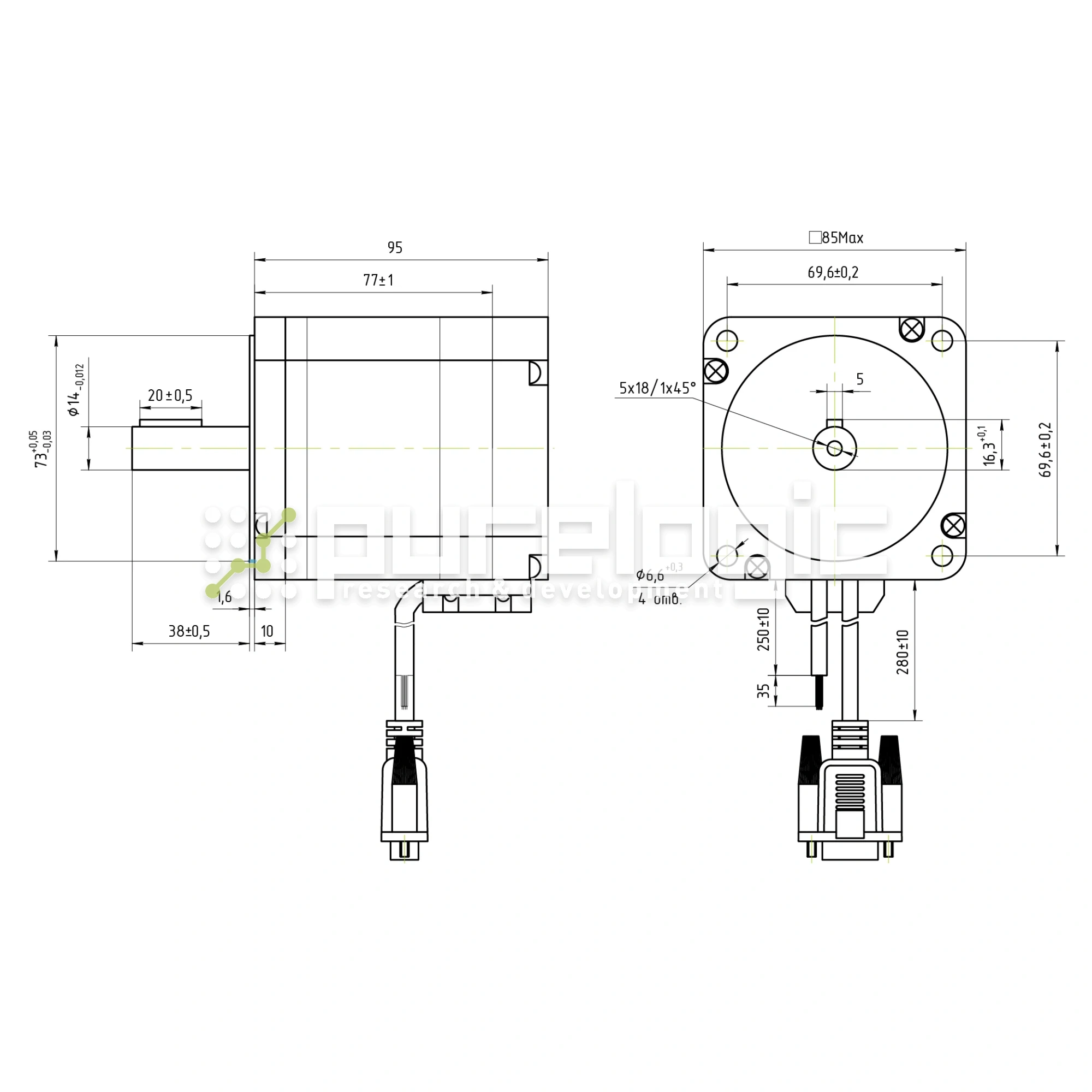 Сервошаговый двигатель с 2 фазами (сопротивление фазы 0.3Ω±15% при 20°) имеет момент удержания 4.2Н*м и угловой шаг 1.8°±5%. Рабочий ток двигателя - 5.6А. Прочность диэлектрика шагового серводвигателя составляет 500VAC/1 мин. Оснащен энкодером с разрешением 1000PPR. Электродвигатель совместим с драйверами PLDS880 и PLD1090S. Для этого необходимо подключить драйвер к ПК, запустить PLD Configurator и выбрать установочный профиль данного двигателя.