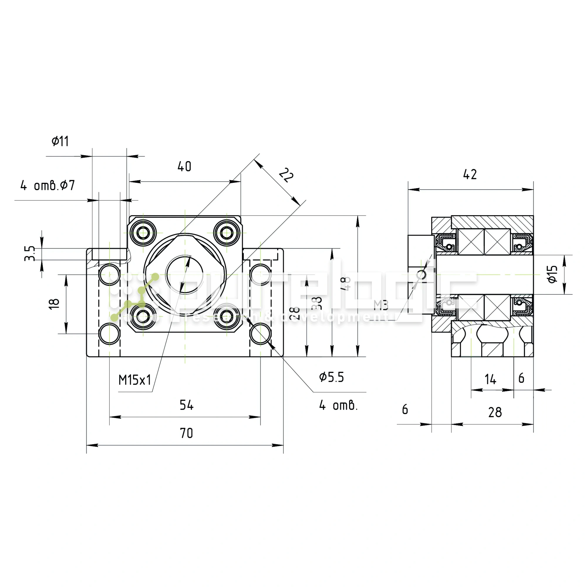Опора для фиксации приводного конца винта передачи. В опоре установлены два радиальных подшипника класса P6, позволяющих зафиксировать винт в радиальном и осевом направлениях. Класс C7. D=15мм