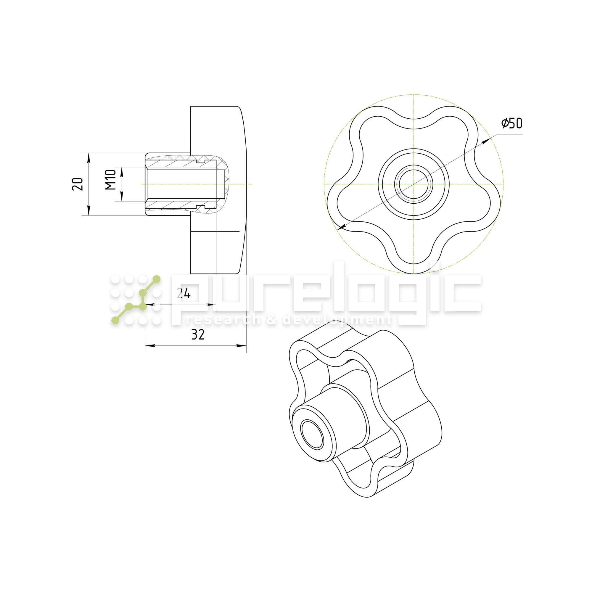 Ручка трехлепестковая для производства промышленной мебели. D=50мм, H=32мм, отверстие М10